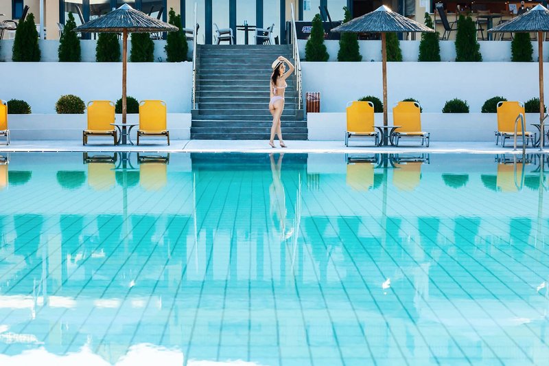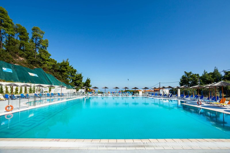 Lage: Das bei Paaren und Familien gleichermaßen beliebte Hotel befindet sich in grüner, reizvoller Umgebung. Die Hanglage am Rande des Ferienortes Pefkochori ermöglicht einen traumhaften Blick auf das Meer. Zum Ortszentrum sind es ca. 500 m und zum beliebten, langen Sand-/Kieselstrand ca. 800 m. Mehrmals täglich 6 mal die Woche fährt ein Shuttle-Bus zum Strand. Liegen und Schirme sind dort gegen Gebühr erhältlich (lokaler Anbieter). Bis zum Flughafen nach Thessaloniki sind es ca. 95km.