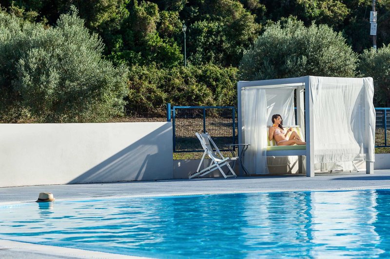 Dobre udržiavaná záhrada s krásne navrhnutým bazénom s bazénom a samostatným detským bazénom, veľkou slnečnou terasou s pohodlnými ležadlami a slnečníkmi (v cene), ako aj bazénom/snack barom s útulnou terasou na oddych. Okrem toho sú pri bazéne k dispozícii ležadlá na Bali (v závislosti od dostupnosti).