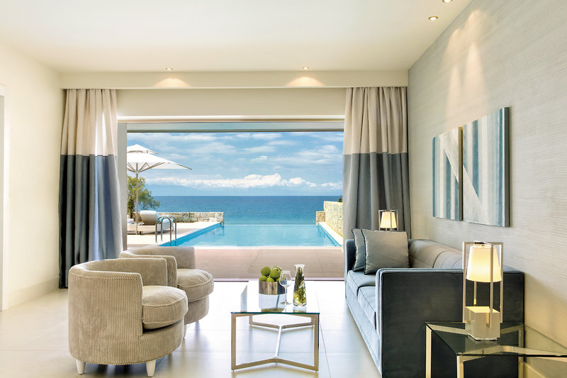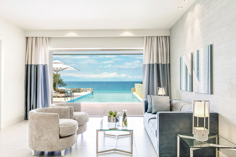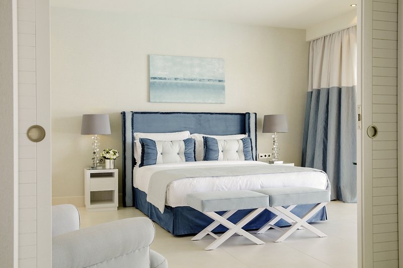 - 41-45 qm, Juniorsuite, Meerblick, Gartenblick, kombinierter Wohn-/Schlafraum, Sitzecke, Dusche, Badewanne, Regendusche, Bademantel, Badeslipper, Haartrockner, Klimaanlage, Heizung, Minibar kostenpflichtig, Safe, TV, Kaffee/Tee, Terrasse (möbliert), Garten