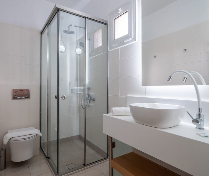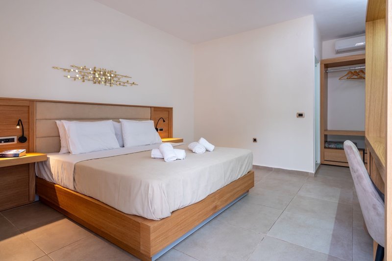 Dvojlôžková izba Superior: Izby zariadené v krétskom štýle majú vaňu alebo sprchu/WC, sušič vlasov, trezor (v cene), individuálne nastaviteľnú klimatizáciu, satelitnú TV, Wi-Fi (v cene), chladničku a balkón alebo terasu (DSU/ DSI).