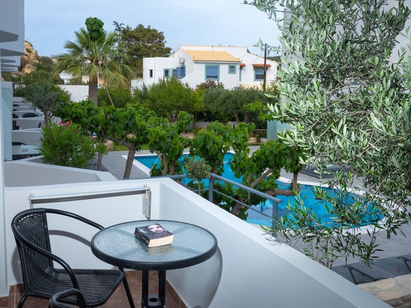 Unterbringung: Doppelzimmer Superior: Die im kretischen Stil eingerichteten Zimmer verfügen über Bad oder Dusche/WC, Föhn, Safe (inklusive), individuell regulierbare Klimaanlage, Sat.-TV, Wi-Fi (inklusive), Kühlschrank sowie Balkon oder Terrasse (DSU/DSI).