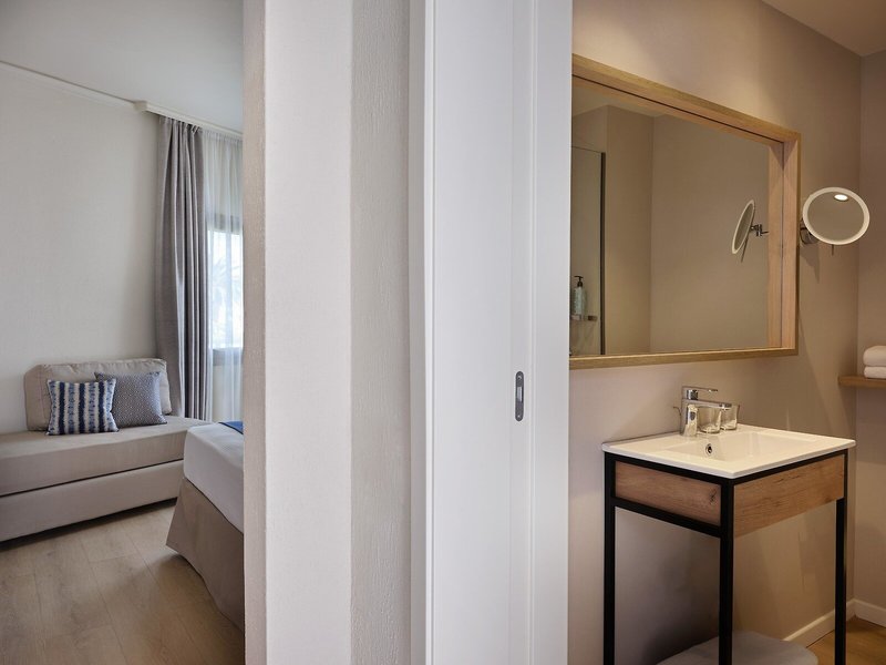 - Suite Sea View (SUM1), Nichtraucherzimmer, im Nebengebäude, Meerblick, ca. 46 - 46 m², letzte Komplettrenovierung 2024, bestehend aus 2 Zimmern, optisch getrennt ohne Tür oder durch Vorhang, 1 King Size Bett (200x200cm), Klimaanlage: Mai - Oktober; wetterabhängig, individuell regelbar, Fußboden: PVC, Safe: ohne Gebühr, Bügeleisen, Bügelbrett, Kühlschrank, Nespressomaschine, Kaffee-/Teezubereiter, Wasserkocher, Telefon, Internet: WLAN/WiFi, Fernseher: Sat-TV, Radio, Roomservice: täglich, gegen Gebühr, Reinigungsservice: täglich, ohne Gebühr, Dusche, Regendusche, WC, Föhn, Kosmetikspiegel, Balkon oder Terrasse: mit Sitzgelegenheit