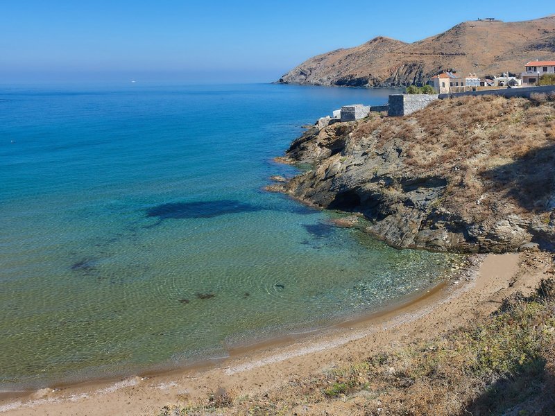 - Pláž Panormo: piesok, schody na pláž, záliv, verejná, ležadlá: za poplatok