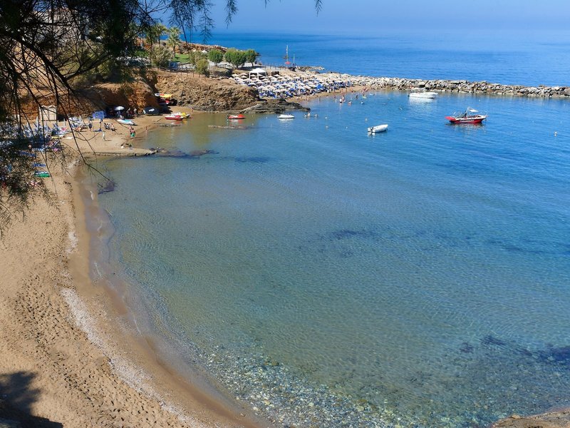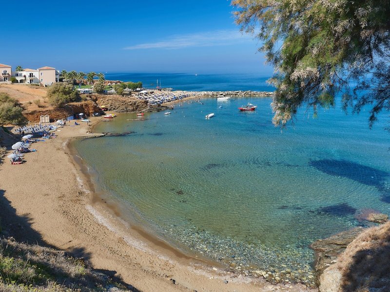 - Pláž Panormo: piesok, schody na pláž, verejná, ležadlá: za poplatok