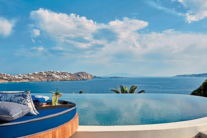 Die Essenz der Kykladen zusammengefasst in einem eldlen Boutique-Hotel mit kosmopolitischem Charme – das ist Katikies Mykonos. Das Schwesterhotel des berühmten Katikies Santorini liegt ca. 50 Meter oberhalb des feinen Strandes von Agios Ioannis, einem kleinen Dorf an der Südwestküste der Insel und nur wenige Kilometer von Mykonos-Stadt entfernt. Im Stil eines Amphitheaters erbaut, bieten sich von den beiden Infinity-Pools, der Terrasse, den Restaurants und Bars sowie von den Zimmern und Suiten herrliche Blicke auf die Ägäis und die vorgelagerte Insel Delos. Außerdem steht ein exquisites Spa als auch ein Fitness-Center und die MO’s Fashion Boutique zur Verfügung. Mykonos-Stadt ist in ca. 4 km erreichbar. Der Hafen und Flughafen ist jeweils ca. 4,5 km entfernt.