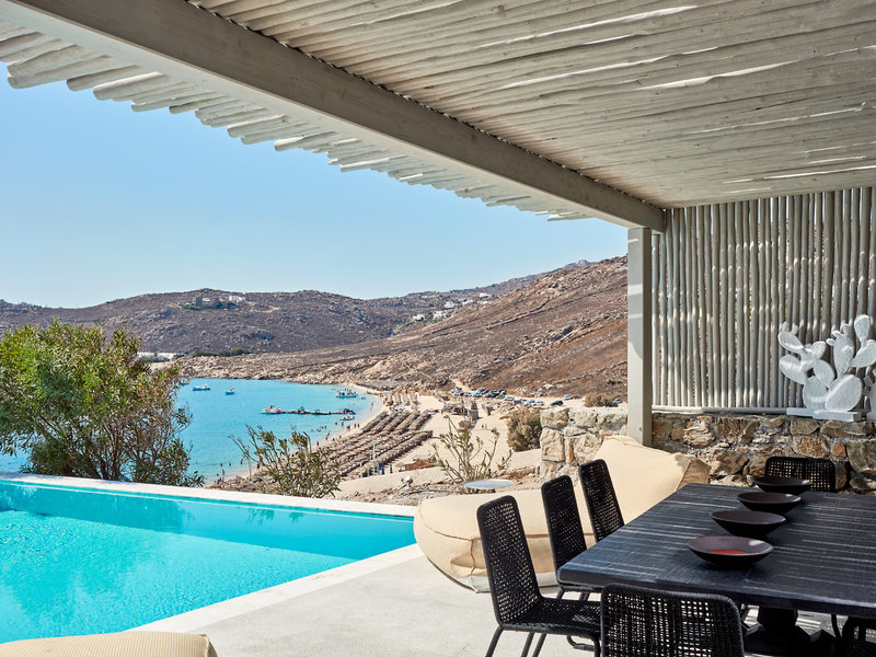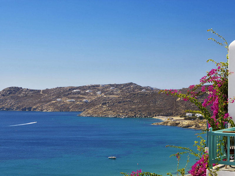 Poloha a okolie Nad piesočnatou/kamienkovou plážou, na svahu s nádherným panoramatickým výhľadom na tmavomodré Egejské more. Na pláž je to po strmej prístupovej ceste cca 200 m, možno použiť aj schody. V sezóne sú priamo na pláži 2 až 3 plážové taverny. Mesto Mykonos je vzdialené cca 12 km, Ano Mera cca 3 km, autobusová zastávka cca 300 m Vlastný hotelový kyvadlový autobus (frekvencia závisí od sezóny), na pláž a do mesta Mykonos.
