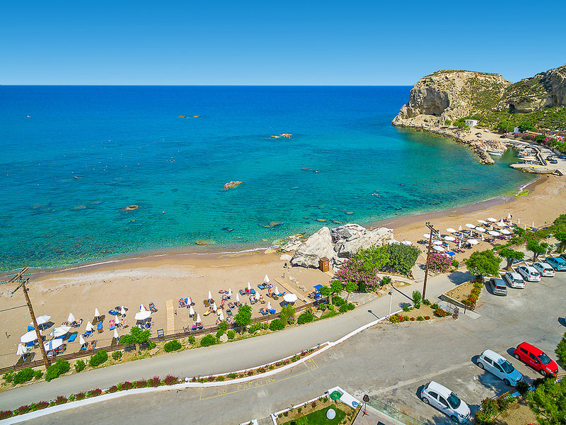 Lage: Direkt am flach abfallenden Sandstrand (mit groben Kieseln durchsetzt) an der Stegna-Bucht, die zu den schönsten Buchten der Insel zählt, mit tollem Panoramablick. Das Dorf Archangelos ist ca. 4 km entfernt.