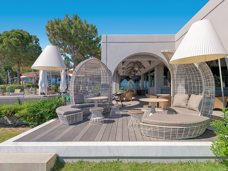 Ausstattung: Komfortable Clubanlage inmitten eines großen Gartens. 3 Swimmingpools, Sonnenterrassen, Liegen, Schirme, Badetücher am Pool/Strand, Pool-/Snackbar. Empfangshalle, Rezeption, WLANim ges. Hotel, Hauptrestaurant mit Außenterrasse und schönem Meerblick, À-la-carte-Restaurant"Aurora" mit Terrasse (geg. Geb.), griechische Taverne, 'Ouzaki Anemos",Nautilus-Bar,Selini-Cocktailbar (Markengetränke gegen Gebühr) mit Panoramablick.Amphitheater, Diskothek (2x wöchentlich; Juni-September). Minimarkt. Wäschereiservice (geg. Geb.). Landeskategorie: 5 Sterne, 270 Zimmer.