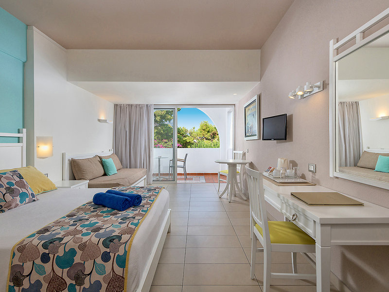 Familienzimmer (FZ, ca. 26 qm), Wohn-/Schlafraum, Klimaanl., Kühlschrank, Kaffee-/Teezubereiter (tägl. Auffüllung), TV, WLAN, Safe, Kissenmenü. Bad, WC, Föhn, Bademäntel und Slipper. Balkon/Terrasse, wahlw. Meerblick (FSM). Max. 3E+1K