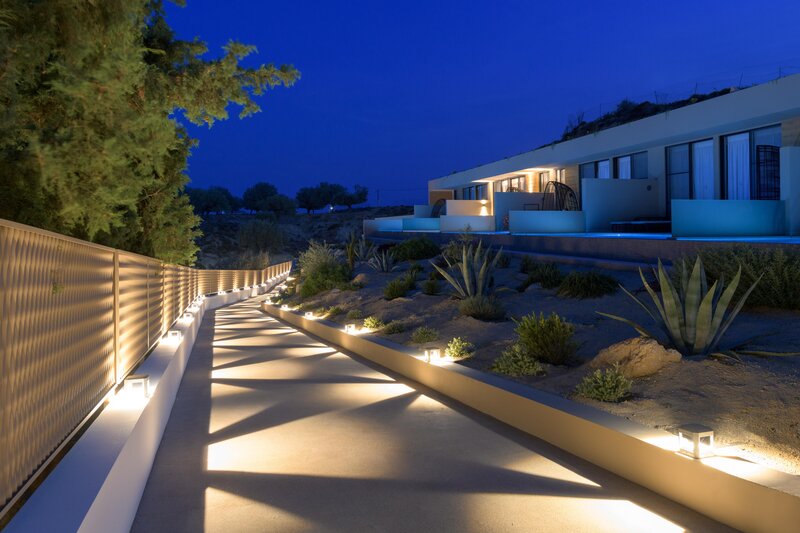 Juniorsuite (JS, ca. 32 qm), in oberster Hanglage, optisch abgetrenntes Schlafzimmer, Klimaanlage, Kühlschrank, Minibar (tägl. Auffüllung mit Wasser, Softgetränken und Säften), Kaffee-/Teezubereiter (tägl. Auffüllung), Espressomaschine (tägl. Auffüllung), TV, WLAN, Safe, Kissenmenü. Bad, WC, Föhn, Bademantel, Slipper. Terrasse, privater Pool. Max. 3E+1K