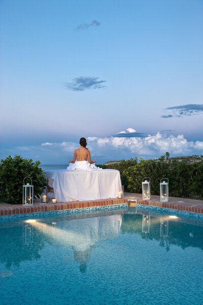 Apartmán (SU, cca 32 m2; RHO144, od 18 rokov), v oddelenej časti rezortu, obývacia izba s rozkladacou pohovkou, samostatná spálňa (oddelená posuvnými dverami), klimatizácia, chladnička, minibar (denne dopĺňaný voda, nealkoholické nápoje a džúsy), kávovar/čajník (denne dopĺňaný), espresso kávovar (denne dopĺňaný), 2 smart TV, WiFi, trezor, vankúšové menu, Služba večerného rozostlania. Dažďová sprcha, WC, fén, župany, papuče. Veľká terasa, súkromný bazén, lehátka, výhľad na more. Maximálne 3E