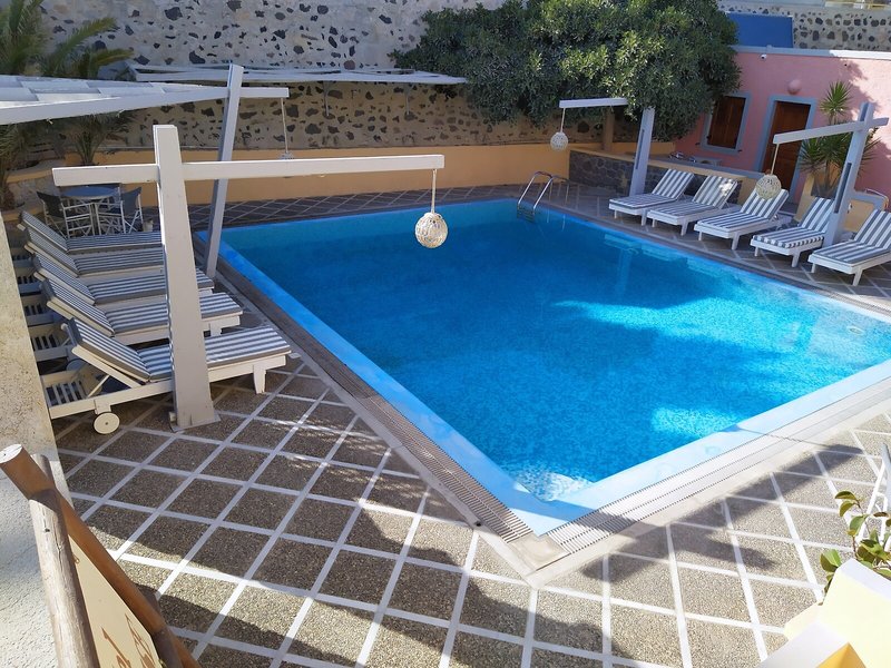 Poloha a okolie Hostia hotela sa ubytujú na výhodnom mieste v meste Fira, jednej z najcentrálnejších oblastí v hlavnom meste. Najlepšie reštaurácie, bary, kaviarne a butiky sú hneď vedľa hotela. Autobusová zastávka so spojmi na najznámejšie pláže ostrova je neďaleko, len 300 metrov od hotela. Letisko je vzdialené približne 5 km od hotela a najbližšia pláž v Kamari je vzdialená približne 7 km.