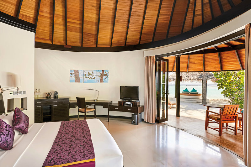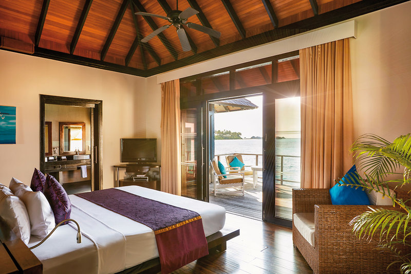 - 81-90 qm, Villa, freistehend, Wasserbungalow (auf Stelzen über der Lagune), Meerblick, kombinierter Wohn-/Schlafraum, Dusche, Whirlwanne, WC, Bademantel, Haartrockner, Klimaanlage, Ventilator, Minibar kostenpflichtig, Safe, TV, DVD-Player, WLAN, Wasserkocher, Kaffee/Tee, Terrasse (möbliert), direkter Meerzugang, Privatpool