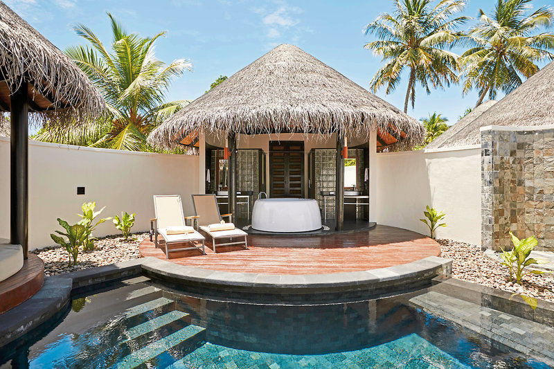 - 81-90 qm, Villa, freistehend, Wasserbungalow (auf Stelzen über der Lagune), Meerblick, kombinierter Wohn-/Schlafraum, Dusche, Whirlwanne, WC, Bademantel, Haartrockner, Klimaanlage, Ventilator, Minibar kostenpflichtig, Safe, TV, DVD-Player, WLAN, Wasserkocher, Kaffee/Tee, Terrasse (möbliert), direkter Meerzugang, Whirlpool, Privatpool