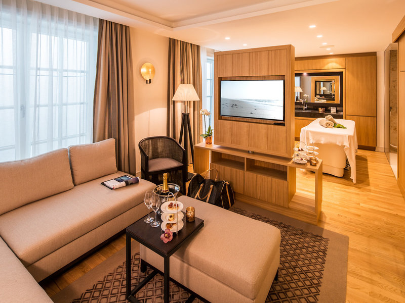 - Spa-Suite, ca. 90 qm (SUX1), Suite, Nichtraucherzimmer, im Hauptgebäude, Neubau, Gartenblick, Blick auf ruhiger Gartenblick, ca. 90 m², letzte Komplettrenovierung 2014, Gesamtanzahl der Räume in diesem Zimmertyp: 3, Aufteilung wie folgt: bestehend aus 2 Zimmern, optisch getrennt durch Schiebetür, Wohnzimmer, optisch abgetrenntes Kinderzimmer, 2 Schlafzimmer, 2 King Size Betten (190x200cm), Babybett: ohne Gebühr, Heizung: individuell regelbar, Fußboden: Fliesenboden, Parkett, Safe: ohne Gebühr, Sitzecke, Sofa, Nespressomaschine, Wasserkocher, Minibar: Softdrinks, Wasser, alkoholische Getränke, Snacks, Minibarauffüllung, Telefon, Internet: WLAN/WiFi: ohne Gebühr, Fernseher: Flatscreen, im Wohnbereich, im Schlafzimmer, Roomservice: gegen Gebühr, Reinigungsservice, Tageszeitung: ohne Gebühr, Regendusche, Badewanne, WC, Bademantel, Slipper, 2 Bäder, Föhn, Kosmetikspiegel, Terrasse: mit Sitzgelegenheit