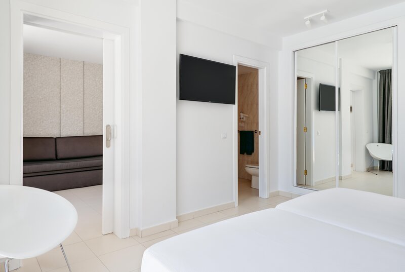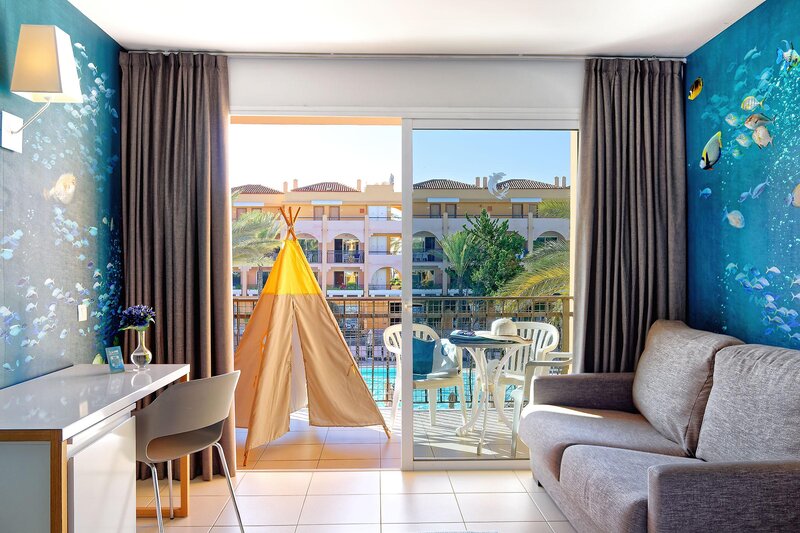 Familienzimmer (FZ, ca. 40 qm), Wohnraum, sep. Schlafzimmer, Telefon, TV, WLAN, Mietsafe, Minibar. Bad/Dusche, WC, Föhn. Balkon/Terrasse, wahlw. mit Poolblick und Klimaanlage (FZP). Max. 3E+1K