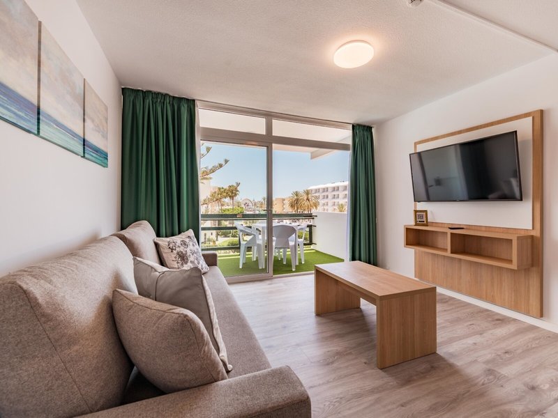 - 1 Bedroom Apartment (APX3), Appartement, Poolseite, Straßenseite, Poolblick, Stadtblick, Blick auf Playa del Inglés, ca. 25 - 40 m², letzte Komplettrenovierung 2021, Gesamtanzahl der Räume in diesem Zimmertyp: 2, Aufteilung wie folgt: Wohnzimmer, 1 Schlafzimmer, 2 Einzelbetten (90x190cm), 1 Schlafsofa, Babybett: ohne Gebühr, Anfrage & Reservierung notwendig, Fußboden: Laminat, Parkett, Safe: ab 2.50 EUR, Standventilator, Sofa, Bügeleisen, Bügelbrett, Kochnische, Kühlschrank, Kochplatte, Mikrowelle, Kaffeemaschine, Kaffee-/Teezubereiter, Wasserkocher, Toaster, Minibar: Wasser, Internet: WLAN/WiFi: ohne Gebühr, ca. 0 EUR, Fernseher: Flatscreen, im Wohnbereich, Reinigungsservice: mehrmals pro Woche, ohne Gebühr, Dusche, WC, Föhn, Kosmetikspiegel, Balkon: mit Sitzgelegenheit