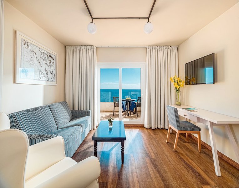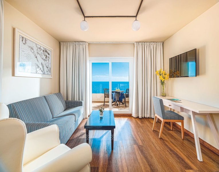 Juniorsuite Meerblick: Die geräumigen und geschmackvoll eingerichteten Juniorsuiten mit separatem Salon sind ausgestattet mit Telefon, TV, Minibar (nach Verfügbarkeit und gegen Gebühr), Mietsafe, Klimaanlage, Bad/WC und Balkon mit frontalem Meer- und Poolblick (J2M).