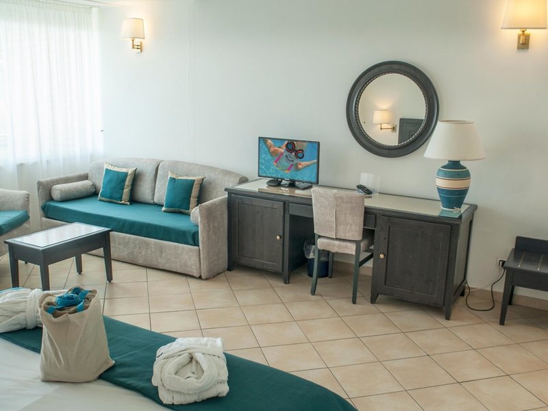 - Junior Suite (JSX1), viacposteľová, nefajčiarska izba, v hlavnej budove, výhľad na more, cca 30 - 32 m², celkový počet izieb v tomto type izby: 1, rozloženie: kombinovaná obývacia izba/spálňa, 1 manželská posteľ, 1 rozkladacia pohovka, 1 prístelka, detská postieľka: cca 10 EUR za noc, poschodie zdarma, klimatizácia: zdarma, klimatizácia: zdarma, trezor: potrebné internet: WLAN/WiFi, TV: plochá obrazovka, vaňa, fén, balkón: s posedením
