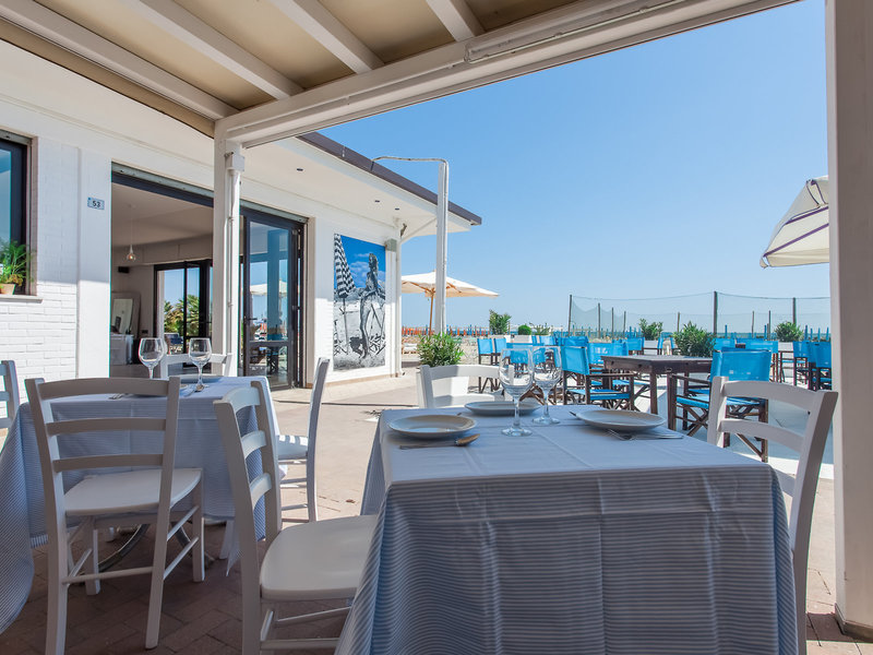 Strandrestaurant, in dem du mittags und abends mit Meerblick speisen kannst. Während die Kinder im