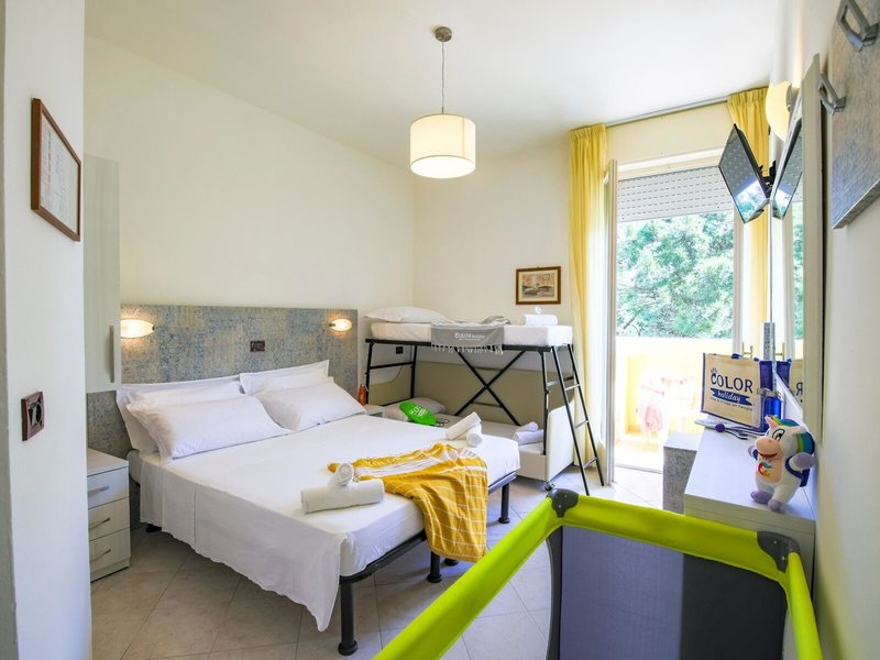 - Double Room Standard 4 Pax (DZX1), Doppelzimmer, im Hauptgebäude, Gartenseite, Parkblick, Blick auf pinienwaldblick, ca. 15 - 17 m², Gesamtanzahl der Räume in diesem Zimmertyp: 1, Aufteilung wie folgt: 1 Schlafzimmer, 1 Doppelbett, Babybett: Anfrage & Reservierung notwendig, 2 Etagenbetten, Klimaanlage: ohne Gebühr, individuell regelbar, Heizung: individuell regelbar, Safe: ohne Gebühr, Kühlschrank, Telefon, Internet: WLAN/WiFi: ohne Gebühr, Fernseher: im Schlafzimmer, Sat-TV, Dusche, Föhn, Balkon: mit Sitzgelegenheit