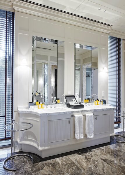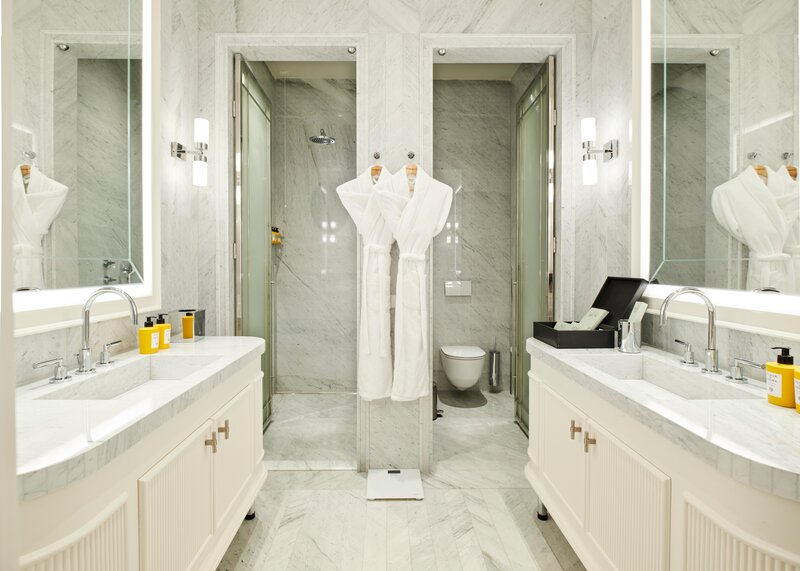 - Whirlpoolwanne, Dusche, 2 Waschbecken, Föhn, Bademäntel, Slipper, Rasier-/Kosmetikspiegel, Personenwaage