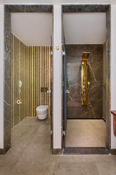 - 2 kúpeľne (sprcha, WC a panel s prúdovým sprchovým kútom, WC); sušič vlasov, župany, papuče, zrkadlo na holenie/líčenie; Kúpeľňové váhy
