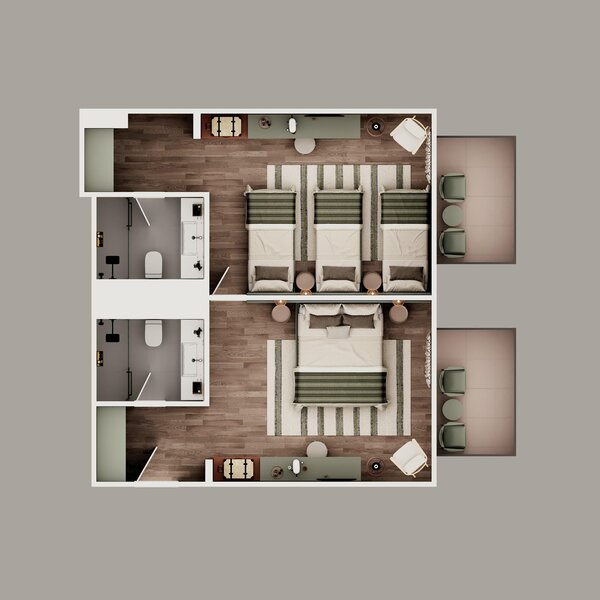 - 2 spálne s manželskou posteľou a 2 samostatnými lôžkami