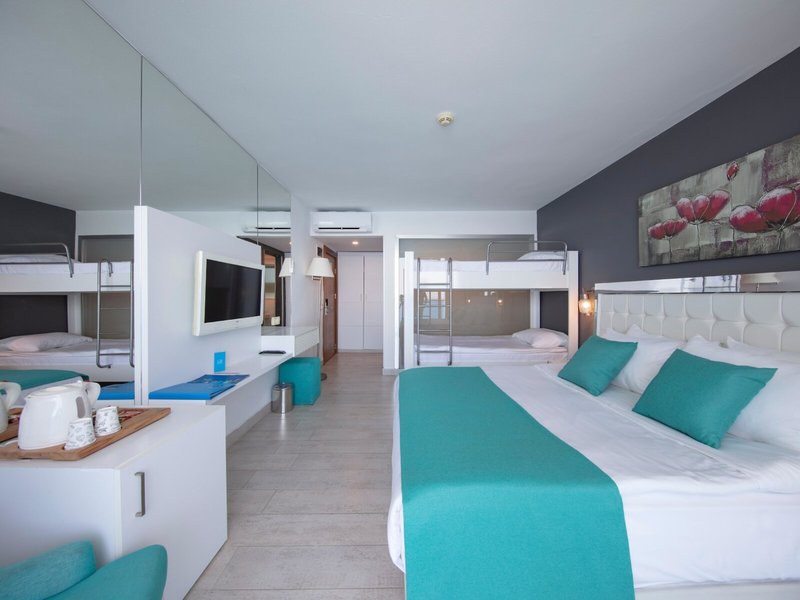 - Bunkbed room with SV (DZM2), Doppelzimmer, Nichtraucherzimmer, Meerseite, Poolseite, Meerblick, ca. 27 m², letzte Teilrenovierung 2019, Gesamtanzahl der Räume in diesem Zimmertyp: 1, Aufteilung wie folgt: 1 Schlafzimmer, Babybett: ohne Gebühr, Anfrage & Reservierung notwendig, 1 Etagenbett, Klimaanlage: ohne Gebühr, individuell regelbar, kalt, warm, Fußboden: Laminat, Safe: ohne Gebühr, Kaffee-/Teezubereiter, Wasserkocher, Minibar: gegen Gebühr, Softdrinks: gegen Gebühr, Wasser: ohne Gebühr, alkoholische Getränke: gegen Gebühr, Telefon, Internet: WLAN/WiFi: ohne Gebühr, Fernseher: Flatscreen, Roomservice: täglich 24 Stunden, gegen Gebühr, Reinigungsservice: täglich, ohne Gebühr, Badewanne oder Dusche, WC, Slipper: ohne Gebühr, Föhn, Balkon: mit Sitzgelegenheit