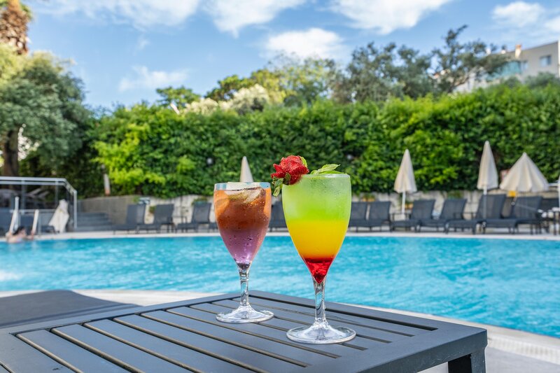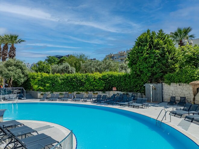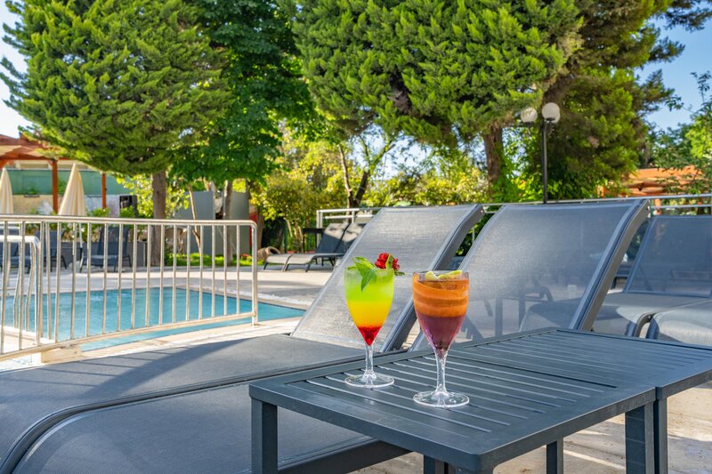 - Slnečníky a ležadlá sú v cene pri bazéne, na pláži za poplatok