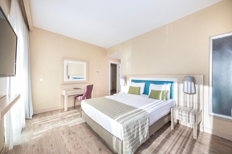 Ubytovanie: Dvojlôžková izba (cca 32 m²), klimatizácia (centrálne ovládaná; hodinová), pohovka, TV, Wi-Fi, minibar, trezor. Sprcha, WC, fén. Balkón, voliteľne s výhľadom na bazén (DZP). Max. 3 dospelí + 1 dieťa