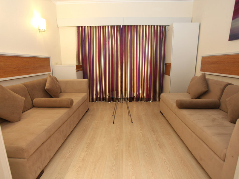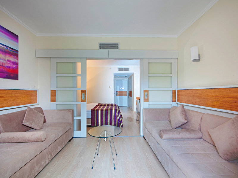 - Suite Room (SUX1), Familienzimmer, im Hauptgebäude, eingeschränkter Meerblick, ca. 37 - 39 m², letzte Komplettrenovierung 2013, Gesamtanzahl der Räume in diesem Zimmertyp: 2, Aufteilung wie folgt: 2 Schlafzimmer, Babybett: ohne Gebühr, Anfrage & Reservierung notwendig, Klimaanlage: ohne Gebühr, wetterabhängig, zentral gesteuert, Fußboden: Laminat, Safe: ohne Gebühr, Kühlschrank: ohne Gebühr, Telefon, Internet: WLAN/WiFi: ohne Gebühr, Fernseher: Flatscreen, Reinigungsservice: mehrmals pro Woche, ohne Gebühr, Dusche, WC, Föhn, Balkon: mit Sitzgelegenheit